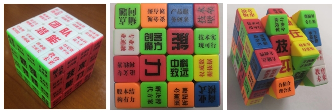 创客魔方是依托中科创客智盘逻辑思想幻化而成,在思考创业面临的问题时候,通过游戏方式激发创客的思维。创客魔方采用4阶设计,共有96个方块,除了商标和宣传外,有价值内涵的共有81块,象征“八十一难,修成正果”之意,通过不同的组合,幻化出来3240个组合,让学生找到关键因素的关联,真正找到创新转化的关键要素。