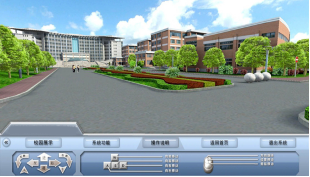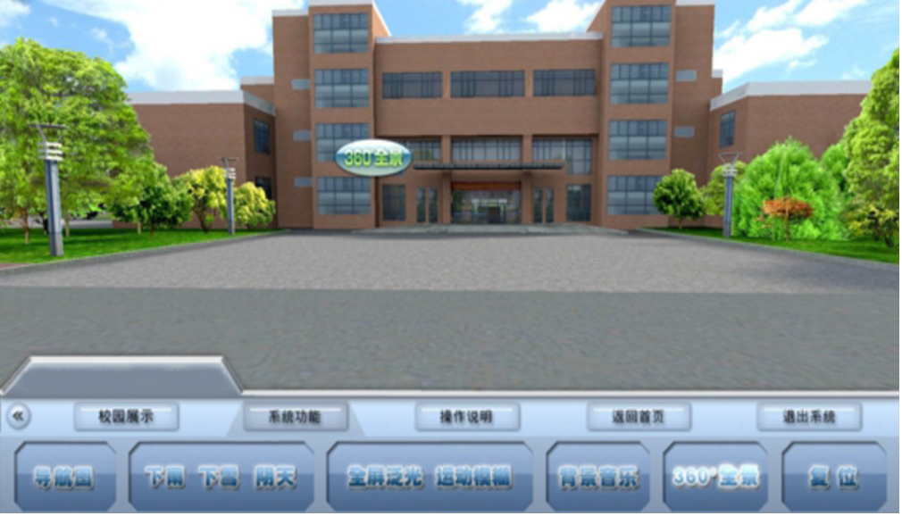 ◎场景展示模块(大屏幕展示)――以游客为第一视角,真实模拟校园的建筑绿化及周边环境,在各关键节点上有视频及文字信息,以供展示使用;