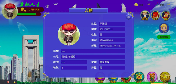 游戏者默认开始有一定的积蓄,游戏开始学生可以进行购置固定资产:房屋、车辆,进行相关的投资:银行存款、购买理财产品(基金、股票),为了生活保障购置相关保险,合理安排自己的日常支出,支付与生活相关各种费用:房租、房贷、物业费、供暖费、购房的各种税费、车辆贷款、车辆保养费等,系统模拟多种家庭模式,并可在一定条件下进行转化,从而综合运用大学中的各种知识,在企业经营的同时,与日常生活、理想等紧密结合起来,从而提升学生的职业能力、理财能力和社会生存能力。