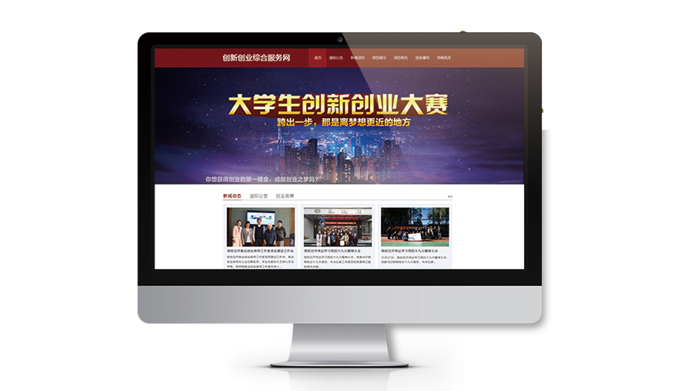 包括首页、通知公告、新闻动态、创业政策、创业辅导、项目展示、创业评测、社团风采、项目报名、导师风采、调查问卷、大赛管理、 创客孵化空间、创业奖学金评审等功能。