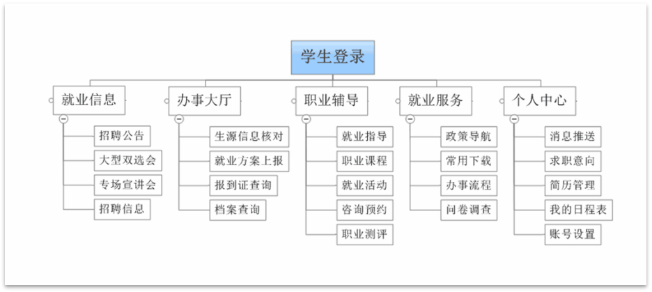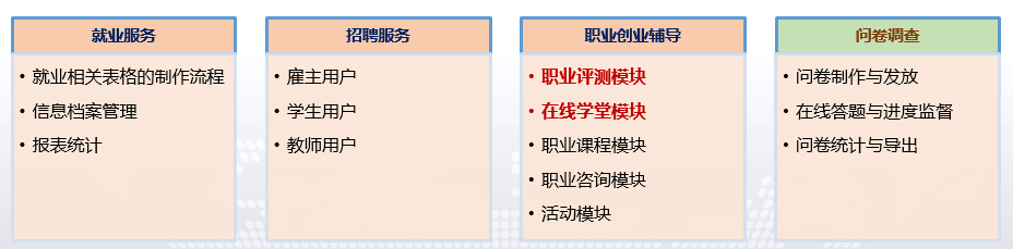 以大学生就业创业为核心的专业服务系统,辅助、培训、管理学生进行就业、创业,提高本校学生的就业创业率,推进、细化大学生就业体系,对不同用户进行精细化、差异化服务;合理的与学院外其他各个系统进行对接;满足微信、APP等新兴媒体的扩展,进一步提升客户体验度。
