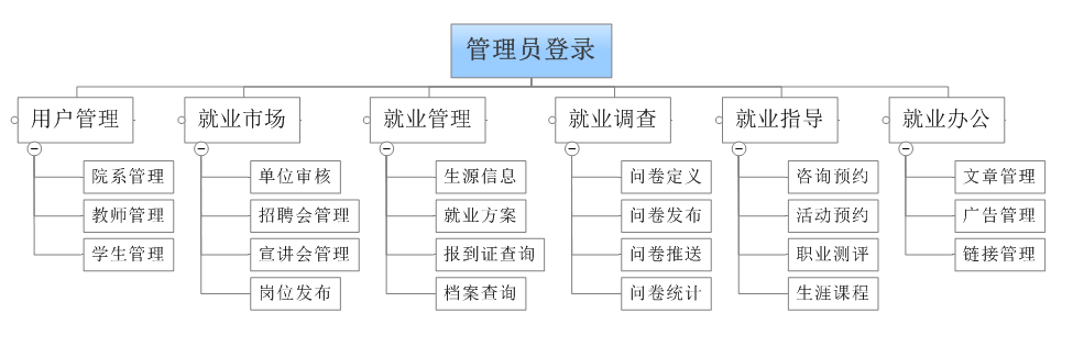 在“互联网+” 的大背景下,为解决就创业指导部门在教育、服务和管理中的问题而提出的,其目的是提升就业工作的效率和规范化水平,使就业指导工作上升到一个新的高度,形成完整的就业信息化支撑体系。